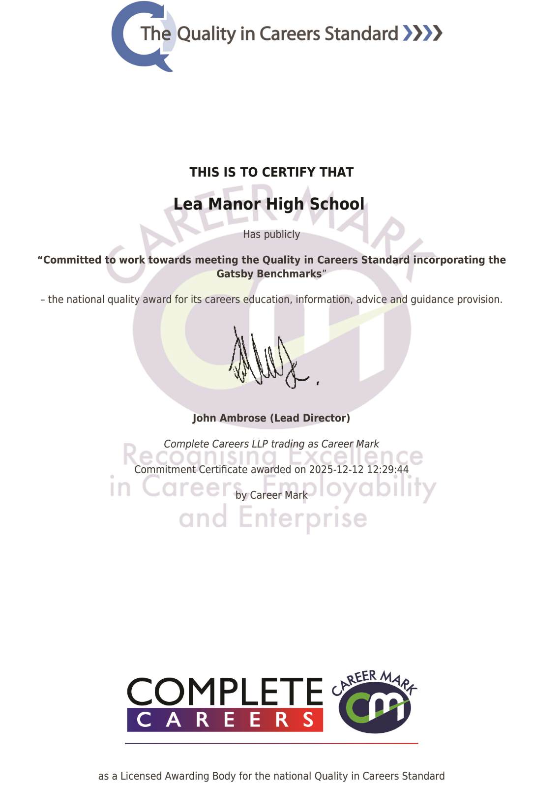 Lea Manor High School has publicly committed to work towards meeting the Quality in Careers Standard incorporating the Gatsby Benchmarks - the national quality award for its careers education, information, advice and guidance provision.